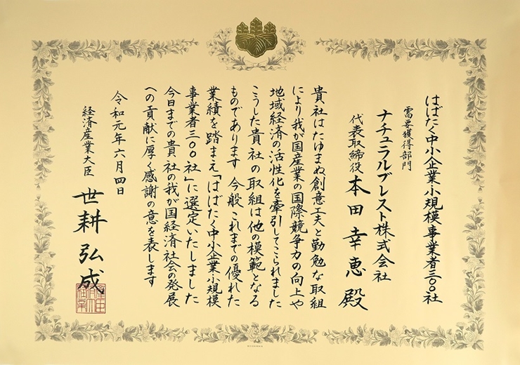 たくさんの乳がん患者様の心と体と生活の改善に役立つ製品です。ITサービス導入や経営資源の有効活用等による生産性向上、これが評価されて今年2019年6月経済産業省から「はばたく中小企業・小規模事業者300社」に選ばれ、受賞いたしました。